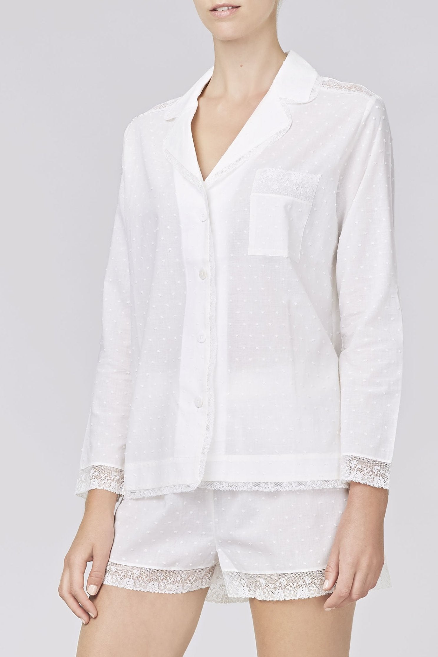 Made from 100% cotton plumetil. This lightweight fabric is super soft, comfortable and has raised dots for additional textural and visual interest. Trimmed with charming 100% cotton Italian lace.