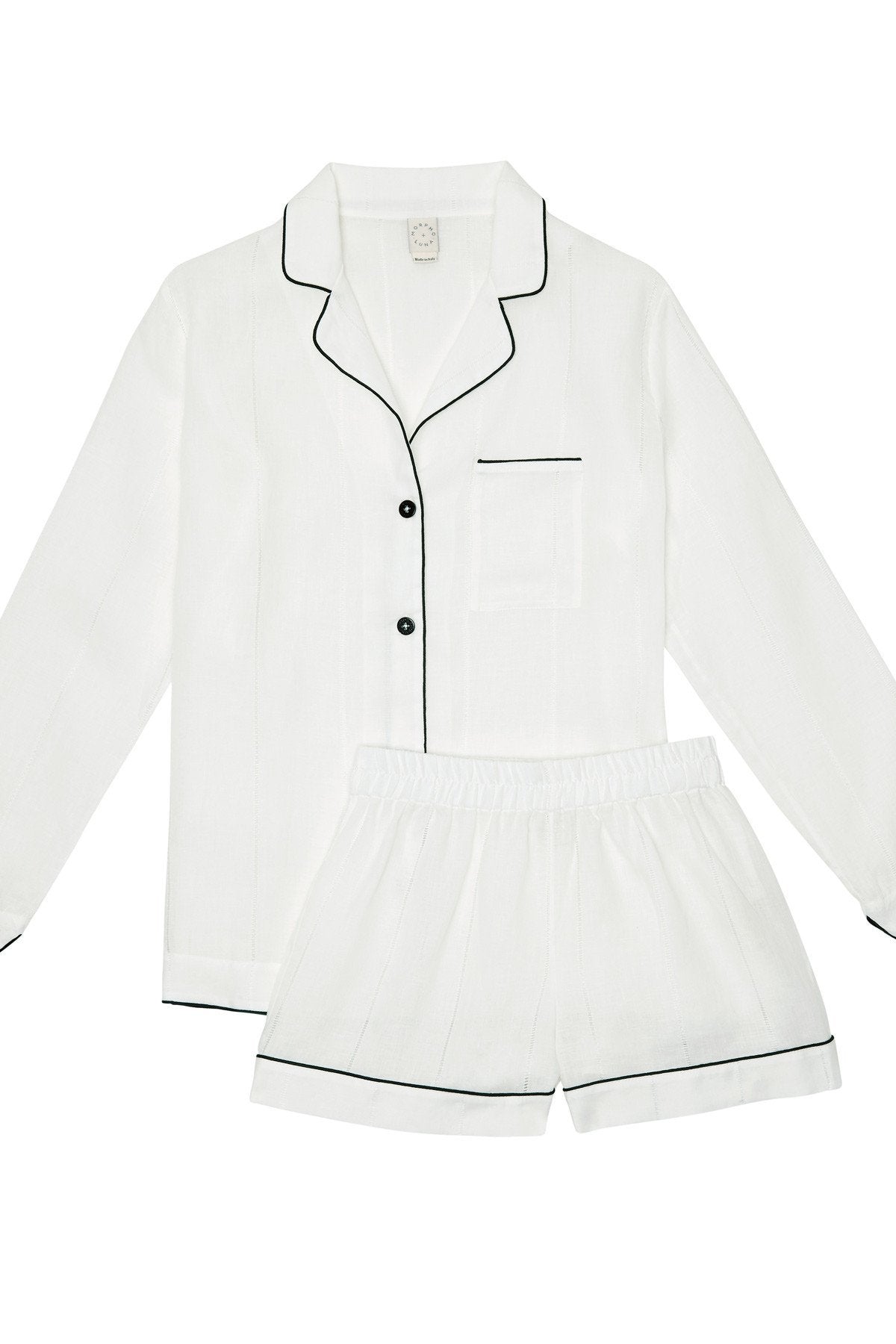 Our pure ajour linen long-sleeved Cara pyjama set can be paired with our matching Alix robe for a lazy Sunday morning or can be worn on a balmy day for a bold and coordinated look. The shirt features curved notch lapels and a practical chest pocket, while the loose-fit shorts have an elasticated waistband for comfort and flattering definition. The set perfectly combines masculine tailoring in the relaxed silhouettes with feminine detailing in the subtly transparent stripes, elegant black satin trim and mother-of-pearl branded buttons - a theme that runs through all of Morpho and Luna's collections.