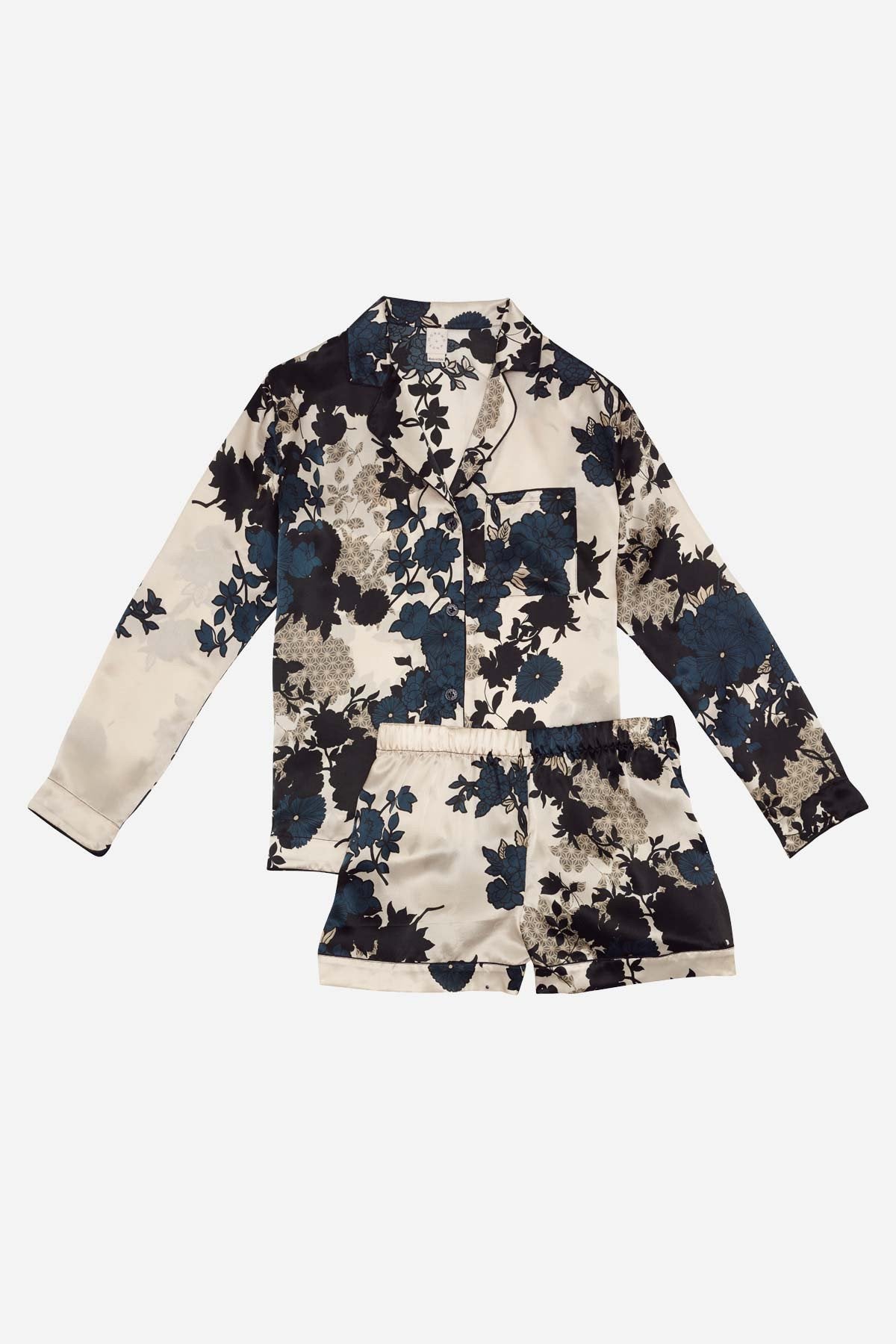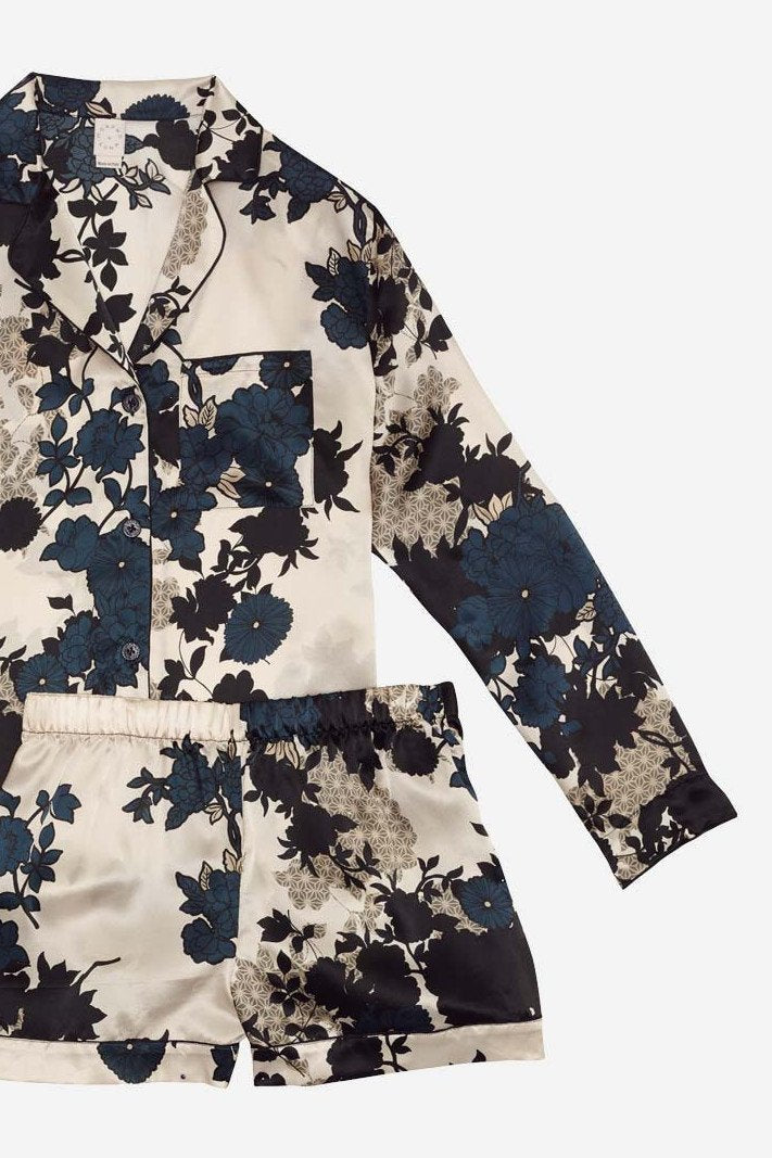 Our pure silk long-sleeved Cara pyjama set can be paired with our matching Jade robe for a lazy Sunday morning or can be worn on a balmy day for a bold and coordinated look. The shirt features curved notch lapels and a practical chest pocket, while the loose-fit shorts have an elasticated waistband for comfort and flattering definition. The set perfectly combines masculine tailoring in the relaxed silhouettes with feminine detailing in the striking floral print, elegant black satin trim and mother-of-pearl branded buttons - a theme that runs through all of Morpho and Luna's collections.