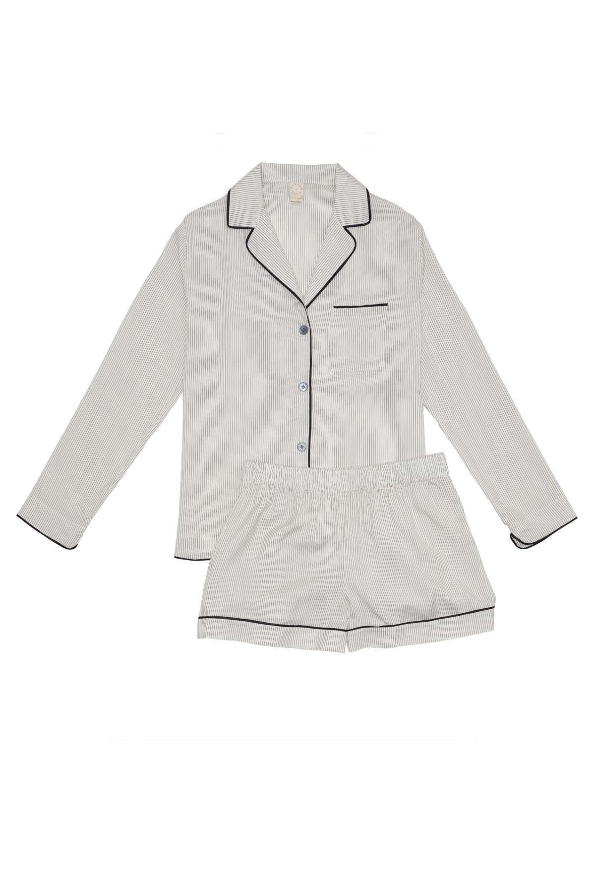 Our pure silk long-sleeved Cara pyjama set can be paired with any of our long-length robes for a lazy Sunday morning or can be worn on a balmy day for a bold and coordinated look. The shirt features curved notch lapels and a practical chest pocket, while the loose-fit shorts have an elasticated waistband for comfort and flattering definition. The set perfectly combines masculine tailoring in the relaxed silhouettes with feminine detailing in the subtle woven pinstripes, elegant black satin trim and mother-of-pearl branded buttons - a theme that runs through all of Morpho and Luna's collections.