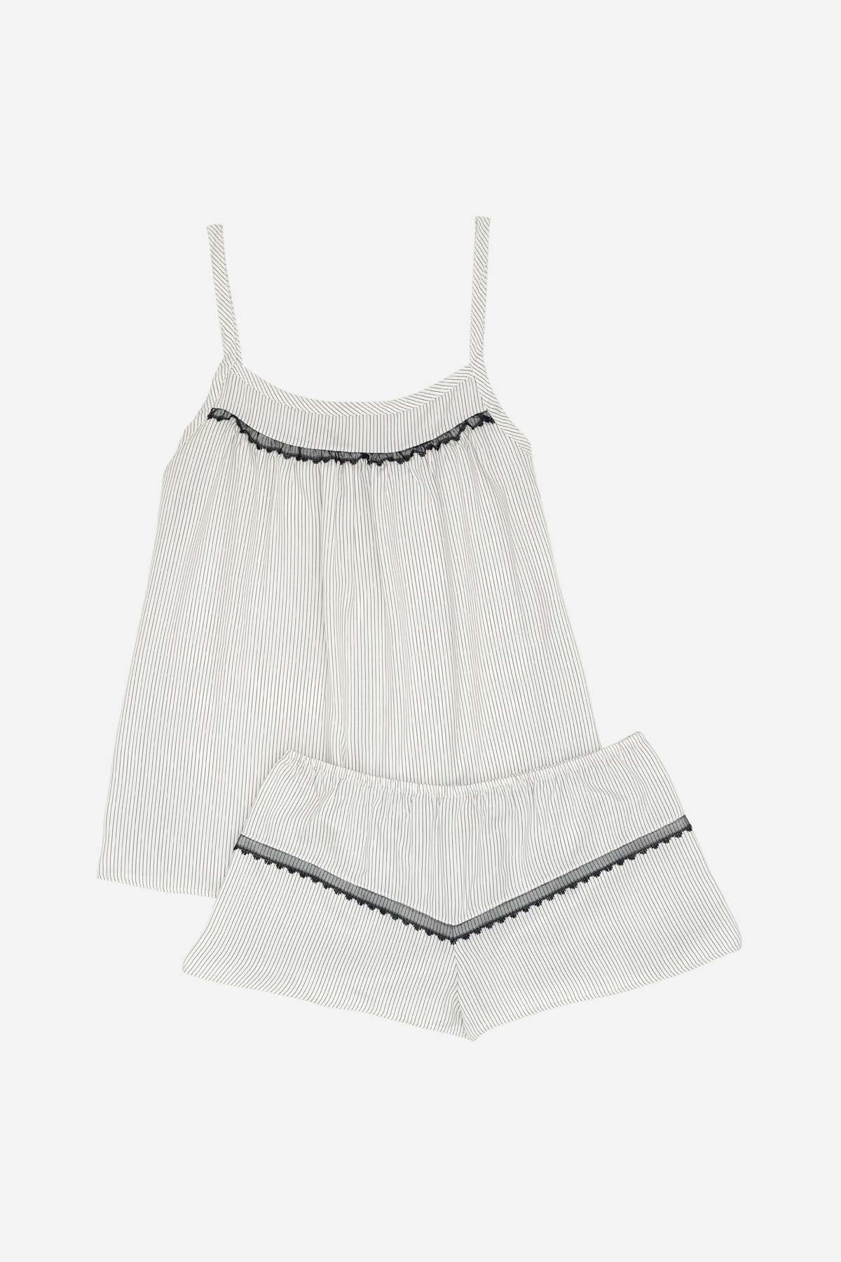 Our striped silk Coco camisole set, paired with a luxurious silk or linen robe is a wonderful combination to wear on balmy evenings. The snow-hued supple fabric and pretty lace trims combine a feminine finish with the loose silhouette of the camisole, while the elasticated waistband on the shorts adds flattering definition and comfort.