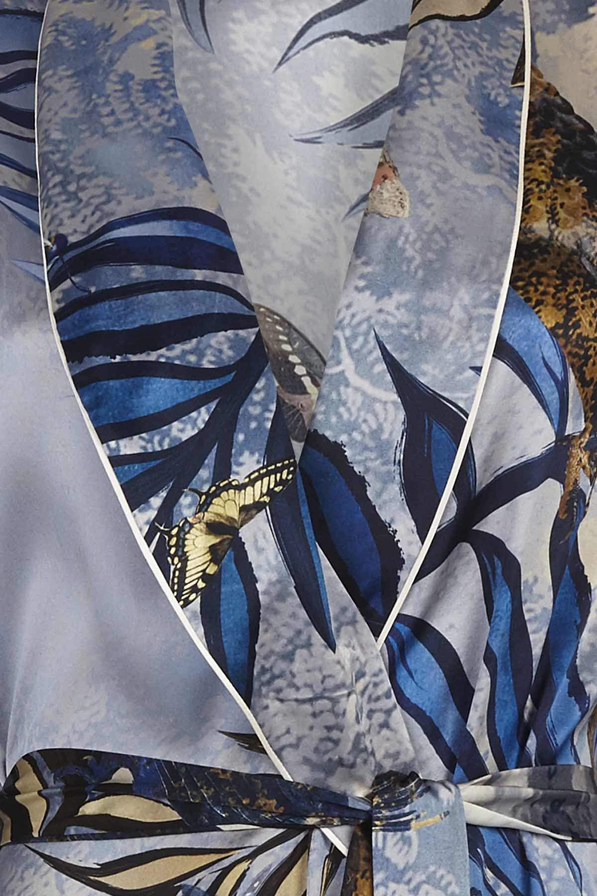 This robe is part of a limited-edition collection for Spring/Summer 18, featuring a bespoke print designed by artist Tom Gallant. The design takes inspiration from the tropical island of Réunion, as well as the artist Henri Rousseau and it features vibrant birds-of-paradise, bold foliage, and delicate butterflies. This deep blue and gold robe encapsulates the idea of bringing the outside world in, and also the beauty of the ‘golden hour’ – the juxtaposition of day and night – a theme that runs through Morpho + Luna’s underlying aesthetic.