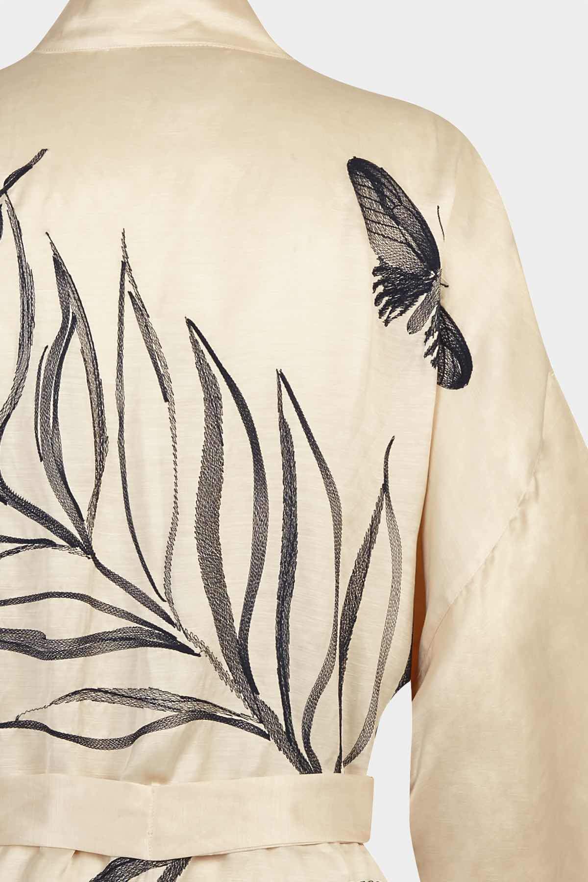 This robe is part of a limited-edition collection for Spring/Summer 18, featuring intricate embroidery of delicate butterflies and bold foliage in a contrasting dark grey ceramic thread designed by artist Tom Gallant. The design takes inspiration from the tropical island of Réunion, and the champagne-hued robe encapsulates the idea of bringing the outside world in, as well as the juxtaposition of day and night – a theme that runs through all of Morpho + Luna’s collections.