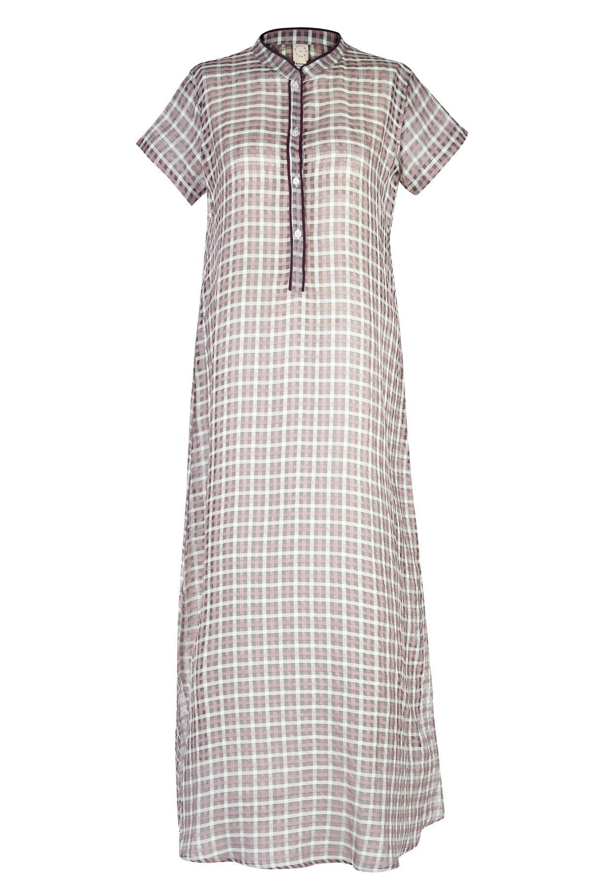 Crafted from cotton and silk, our long-length Grace nightdress paired with any of our long-length robes is perfect for an evening of elegant lounging. Alternatively, wear with ankle boots for a daring daywear look. The delicately transparent checked devoré gingham fabric is lightweight and feels luxurious when worn. Also featuring short sleeves and a loose yet flattering silhouette as well as burgundy satin trim and mother-of-pearl branded buttons, this nightdress beautifully blends masculine tailoring with feminine detailing - a theme that flows through all of Morpho + Luna's collections.
