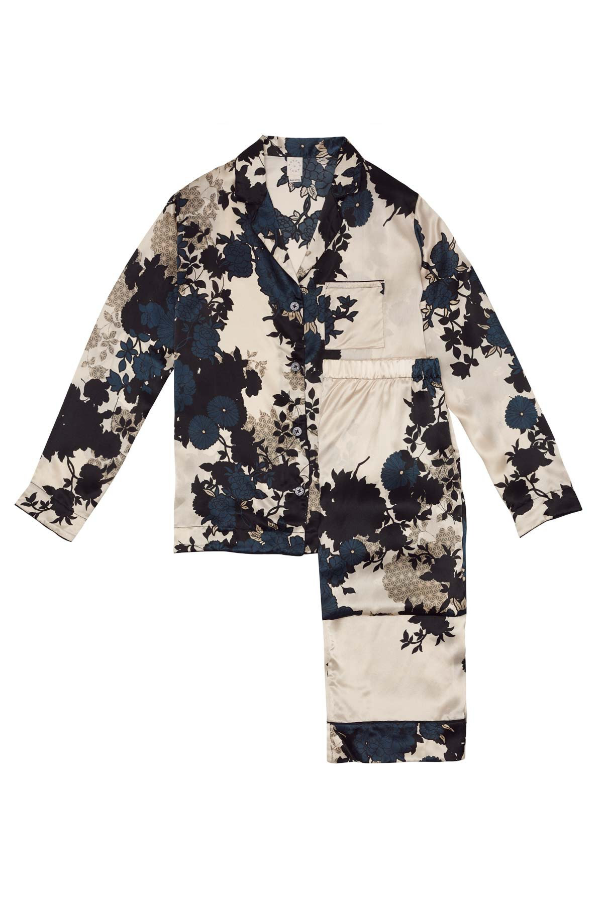 Our pure silk long-sleeved Inès pyjama set can be paired with our matching Jade robe for a lazy Sunday morning or can be worn on a balmy day for a bold and coordinated look. The shirt features curved notch lapels and a practical chest pocket, while the loose-fit straight leg trousers have an elasticated waistband for comfort and flattering definition. The set perfectly combines masculine tailoring in the relaxed silhouettes with feminine detailing in the striking floral print, elegant black satin trim and mother-of-pearl branded buttons - a theme that runs through all of Morpho and Luna's opulent collections. Available in floral printed ivory.