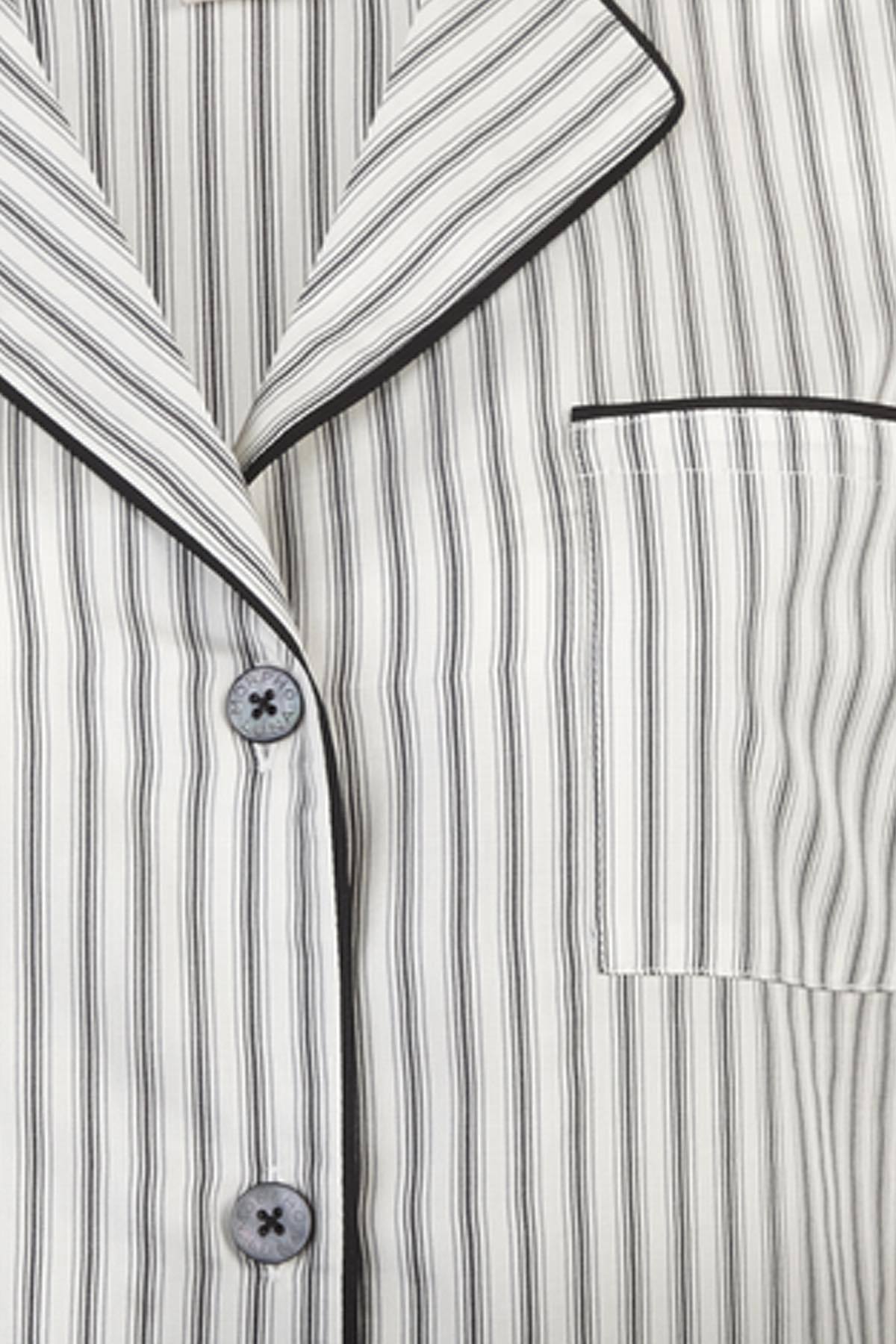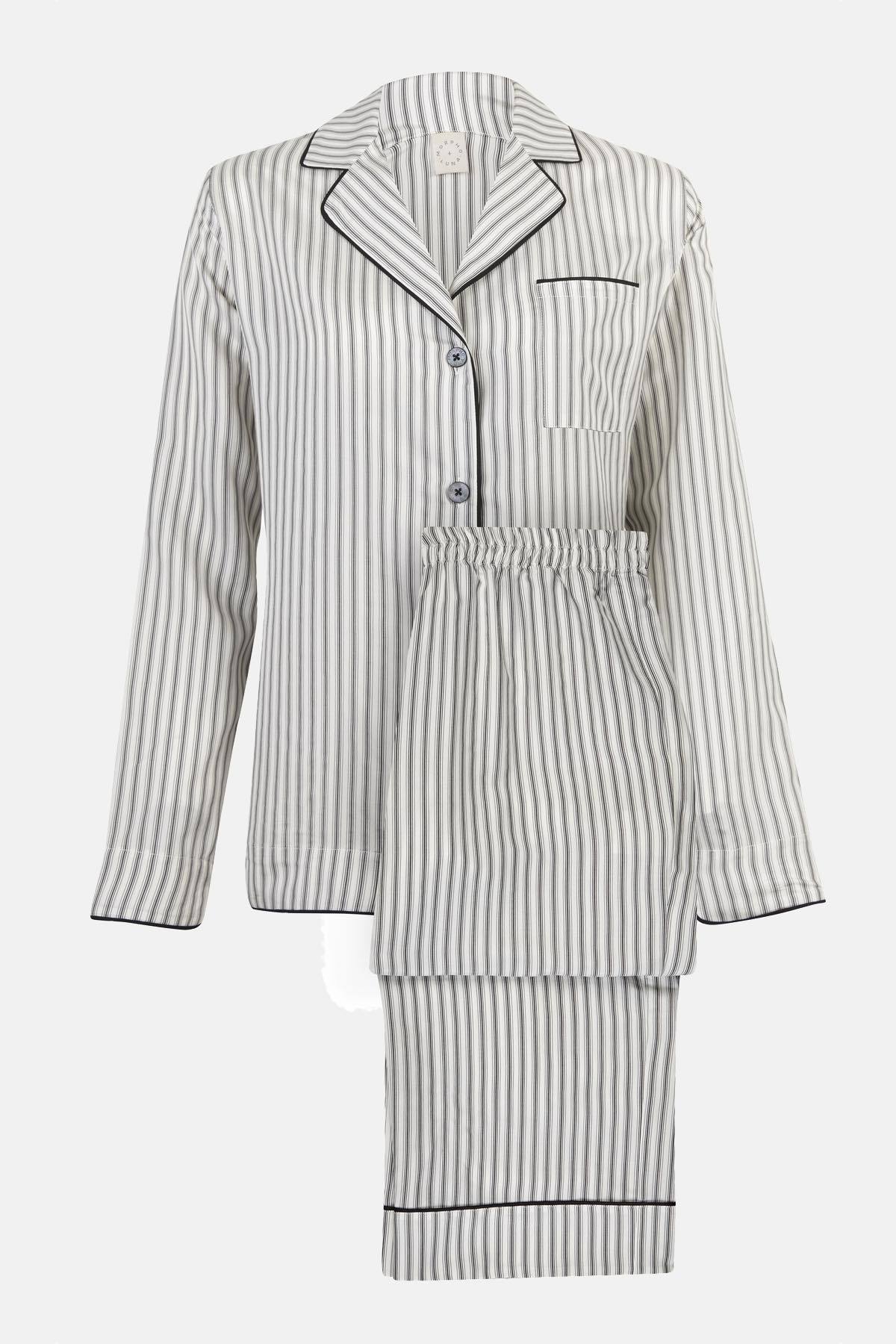 Our pure silk long-sleeved Inès pyjama set can be paired with our matching Alix robe for a lazy Sunday morning or can be worn on a balmy day for a bold and coordinated look. The shirt features curved notch lapels and a practical chest pocket, while the loose-fit straight leg trousers have an elasticated waistband for comfort and flattering definition. The set perfectly combines masculine tailoring in the relaxed silhouettes with feminine detailing in the subtle woven stripes, elegant black satin trim and mother-of-pearl branded buttons - a theme that runs through all of Morpho and Luna's collections.