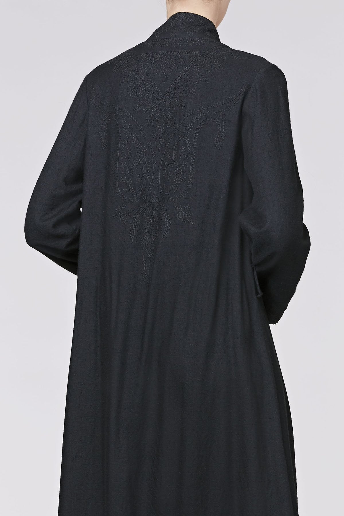 Hand woven in Kashmir, India, this beautiful robe comes in snow, cord, strawberry, petrol blue, night, peony and black and features intricate hand embroidery on the shawl collar, sleeves and back. Featuring loose kimono-style sleeves, beautiful shawl lapel and wide waist tie.