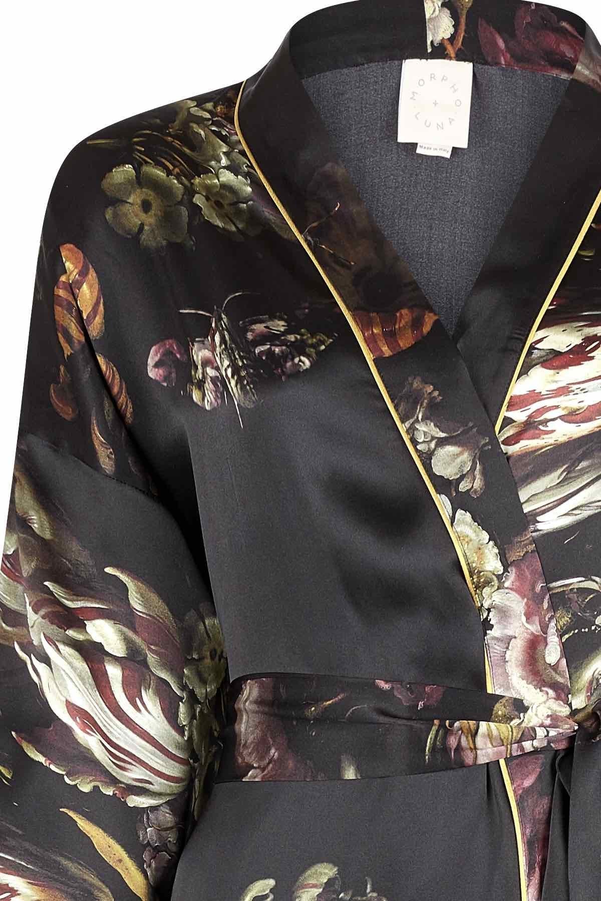 This robe is part of a limited-edition collection for Autumn/Winter 17, featuring a bespoke print by artist Tom Gallant. Expertly printed onto Italian silk in Como, Italy, the design is a modern interpretation of the mythology of Persephone and Demeter. The beguiling print explores the idea of light emerging from darkness – a fitting concept for our refined loungewear, which successfully bridges the gap between nightwear and daywear.
