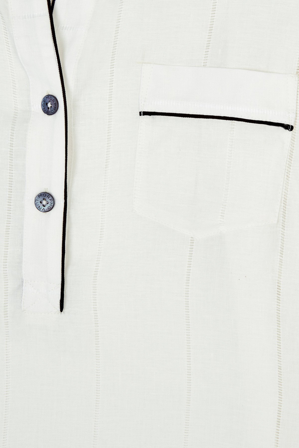 Made from 100% Italian ajour linen. This medium-weight fabric has a soft and smooth texture and features artisanal jour-échelle weaving to create subtle transparent stripes. Trimmed with pure Italian satin.